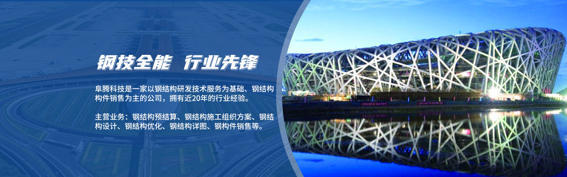 ABOUT US北京阜騰科技發(fā)展有限公司坐落于北京●順義,是一家以鋼結(jié)構(gòu)研發(fā)技術(shù)服務(wù)為基礎(chǔ)、鋼結(jié)構(gòu)構(gòu)件銷售為主的公司,擁有近20年的行業(yè)經(jīng)歷。